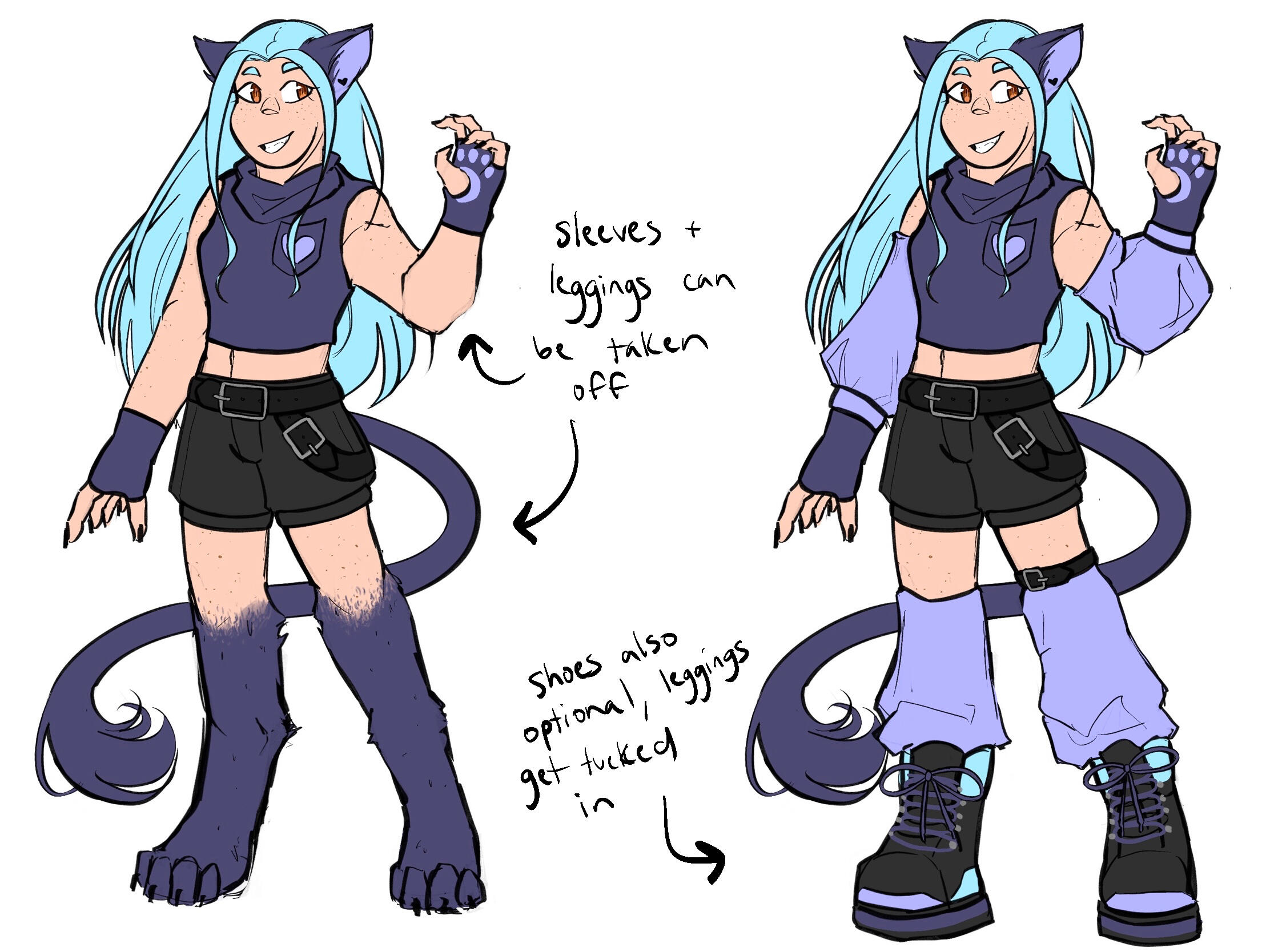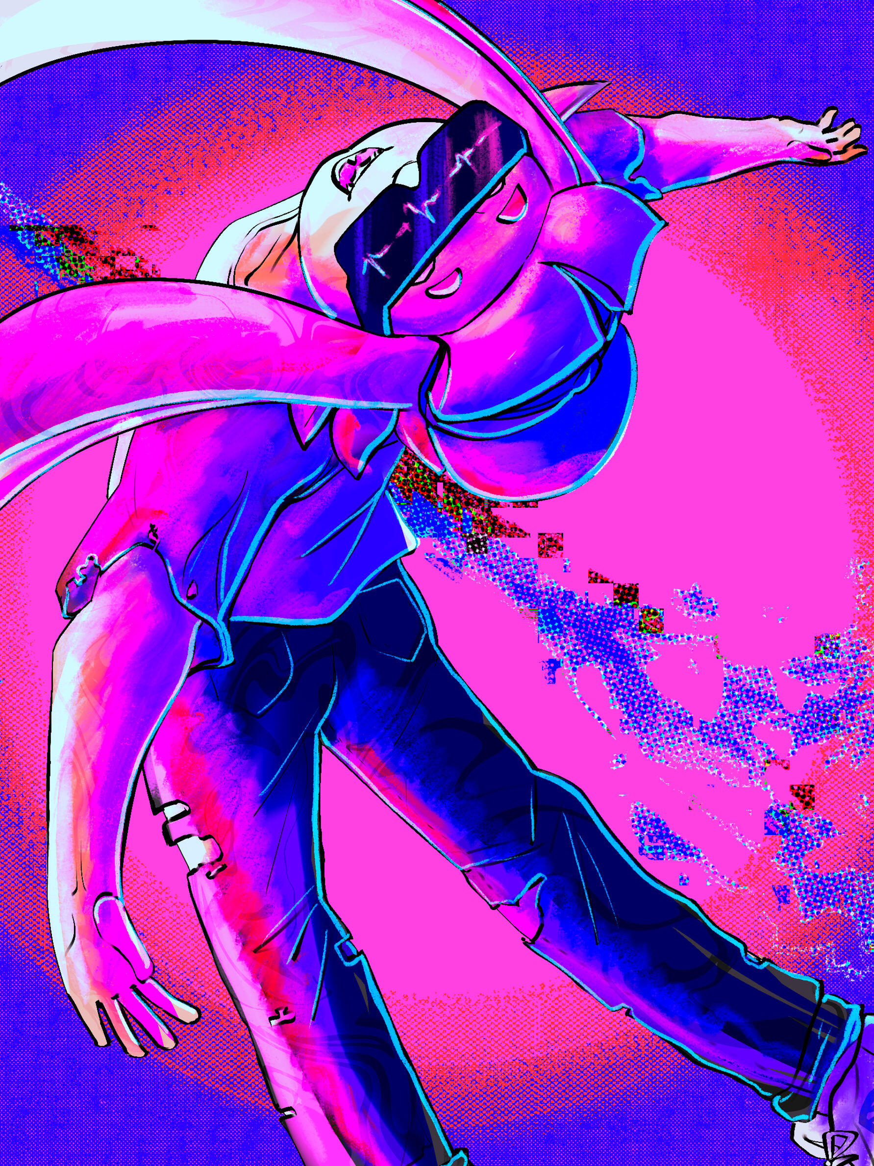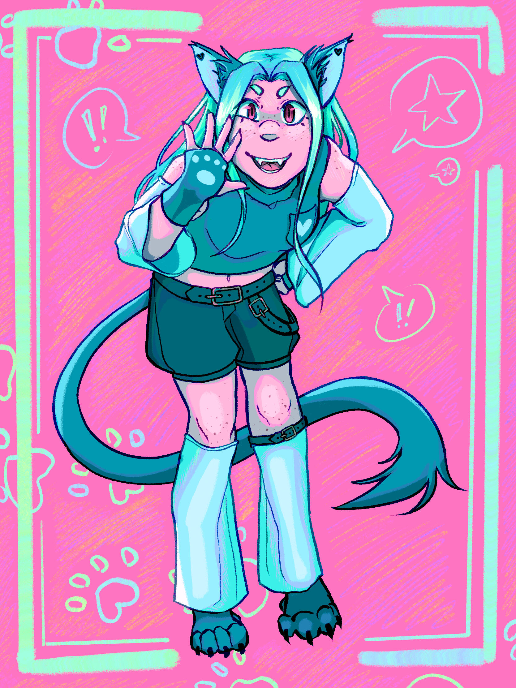 This piece was created in Procreate, featuring my original character Misty. I sketched the pose from scratch, wanting a sassy, active feeling in which she’s leaning forward. I made careful use of line weight so that the viewer’s focus was pulled to certain features. To further emphasize the liveliness of the drawing, I colored the piece with vibrant pinks and blues, using color theory to make unusual shades seem normal, like her bright pink skin. For the background, I wanted it to be simple yet fill in the empty space behind Misty, so I added some small scribbles, speech bubbles, and paw prints that filled out the rest of the page.