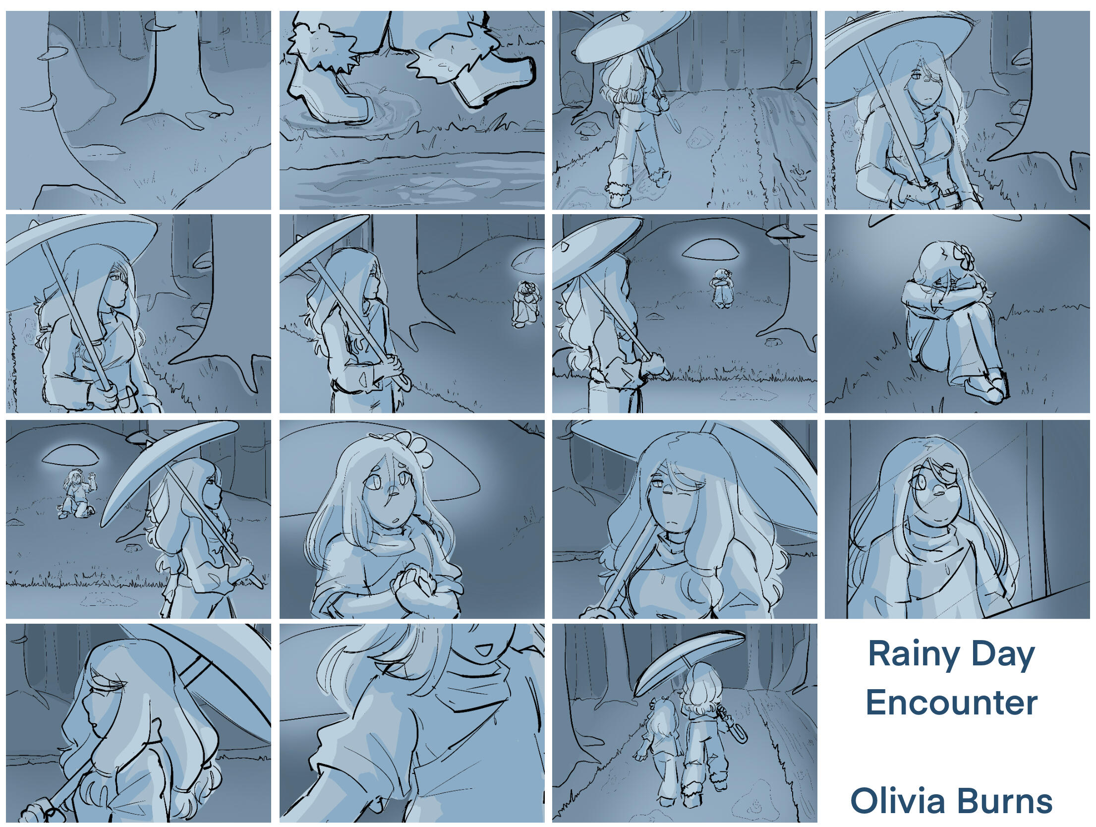 Rainy Day Encounter is a short snippet of an unlikely interaction between Nirvana, an apathetic woman, and Reva, a lost preteen. It began as a storyboard for which I conceptualized and wrote dialogue, alongside recording the speaking lines myself. I created the artwork in Procreate, which involved solving composition issues to follow the 180 rule and some value blocking so the characters stood out from the setting. After creating all of the shots, I plugged them into After Effects where I timed them and moved some of the elements, such as sliding Nirvana to simulate walking. Finally, I animated a simple rain cycle and added ambient sound for atmosphere.