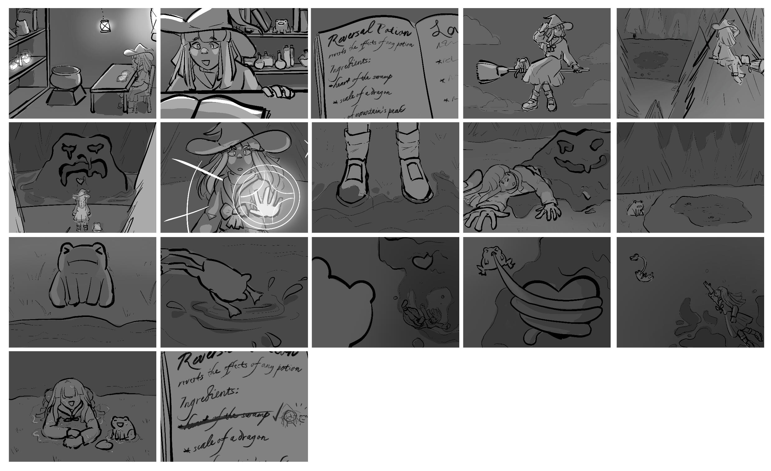 This digital storyboard was created with the limitation of 8 shots with the goal of telling a cohesive, compelling story within this constraint. When a lone witch gets a knock at her door, she’s met by an injured kitten in need of aid. She takes in the cat and sifts through her collection of potions to heal the animal. However, she selected the wrong potion, and ended up turning the kitten into a frog. I devised all aspects of this storyboard, which included designing the characters, designing the world/backgrounds, posing the characters to tell a story without dialogue, and creating compositions to follow the 180 rule.